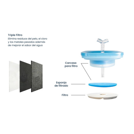 Cada filtro combina tres materiales: algodón, resina de intercambio iónico y carbón activo. El algodón retiene partículas visibles como pelos o restos de comida; la resina ayuda a reducir la dureza del agua, descalcificándola; y el carbón activo purifica el agua y mejora su sabor. Este proceso no solo mantiene la higiene del agua, sino que también estimula a tu gato a beber más, favoreciendo su bienestar diario.