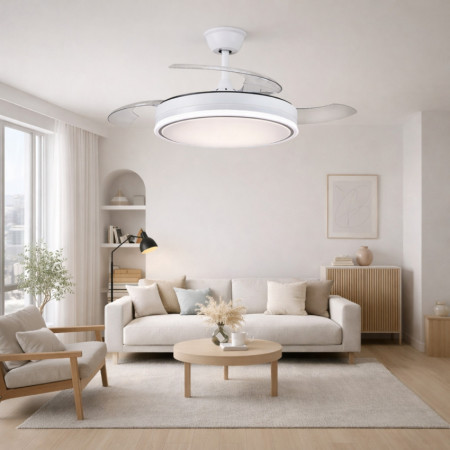 Son design moderne et compact en fait un choix polyvalent pour les chambres à coucher, les salles de séjour ou les espaces multifonctionnels. Les pales rétractables permettent de conserver une esthétique soignée lorsque le ventilateur est éteint, fonctionnant visuellement comme un plafonnier. En somme, Aura offre une solution complète pour améliorer le confort domestique, en combinant une ventilation efficace, un éclairage puissant et un design conçu pour s'intégrer facilement dans différents environnements.