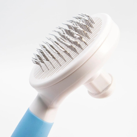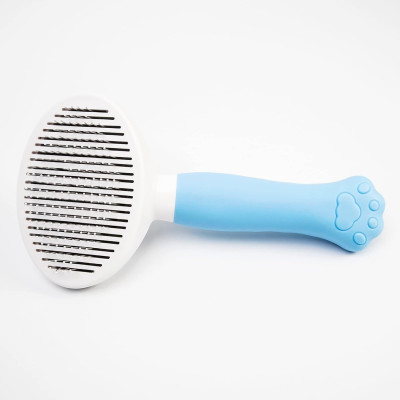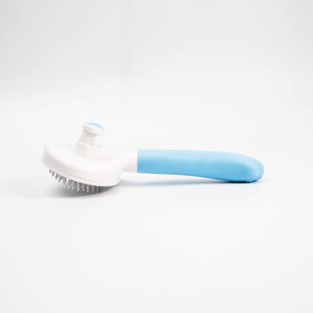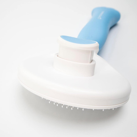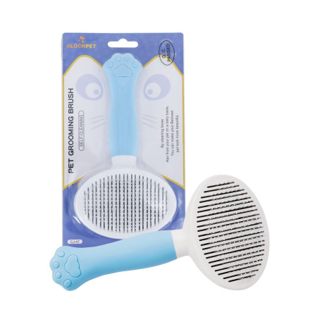 Este modelo possui um sistema de auto-limpeza na parte superior: basta premir o botão para libertar instantaneamente os pêlos recolhidos sem lhes tocar. Isto torna a manutenção muito mais fácil e higiénica após cada utilização. Além disso, a sua pega ergonómica com um design original em forma de pata e uma superfície antiderrapante proporciona uma aderência firme e confortável, facilitando uma escovagem segura mesmo durante longas sessões.