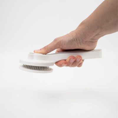 Uma das suas principais vantagens é o sistema de auto-limpeza, que está integrado na parte superior da escova. Basta premir o botão - com o desenho de uma orelhinha gira - para libertar instantaneamente o pelo recolhido, sem necessidade de lhe tocar. Esta caraterística acelera a limpeza após cada utilização e ajuda a manter a escova sempre pronta, facilitando a sua rotina de escovagem.