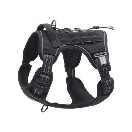 Fabricado em material durável e respirável, este arnês está preparado para suportar uma utilização intensiva sem sacrificar o conforto. Os detalhes reflectores aumentam a visibilidade em condições de pouca luz, proporcionando segurança extra em passeios noturnos. Além disso, possui uma pega superior robusta e uma argola metálica, que permitem diferentes formas de controlo em função da situação: desde um aperto firme e direto até à fixação da trela. Estas caraterísticas fazem dela uma ferramenta versátil para o uso diário, bem como para ambientes mais exigentes, como caminhadas ou treinos.