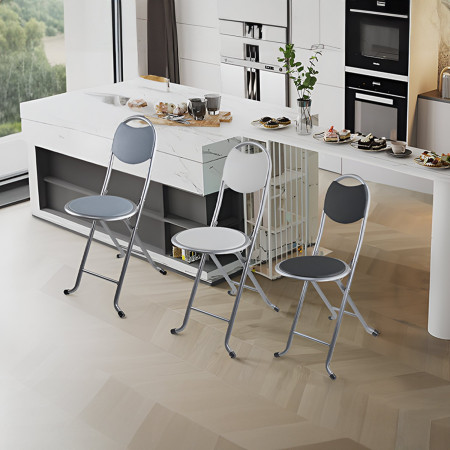 Este banco é feito de aço de alta qualidade, o que o torna uma peça robusta e durável para utilização diária. Para proporcionar o máximo conforto, o nosso modelo Eleonor tem um amplo encosto para apoiar as suas costas, um assento de espuma macia e um apoio para os pés. O seu prático design dobrável poupa espaço de arrumação em casa e facilita o seu transporte. É muito leve. Este banco dobrável com encosto está disponível em várias cores: preto, cinzento e branco. Qual prefere?