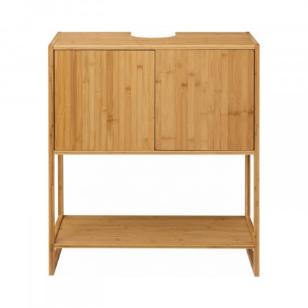 Fabricado en bambú de alta calidad, este mueble es robusto y resistente a la humedad, ideal para el entorno del baño. Su diseño limpio y moderno con puertas lisas ofrece un atractivo estético y facilita la integración en cualquier estilo de decoración. El mueble cuenta con un amplio espacio de almacenamiento, perfecto para guardar toallas, productos de limpieza y otros artículos esenciales del baño. La parte superior está diseñada para acomodar el lavabo, proporcionando un soporte estable y seguro.