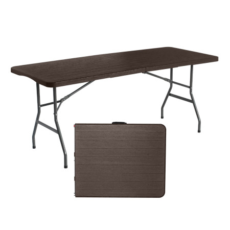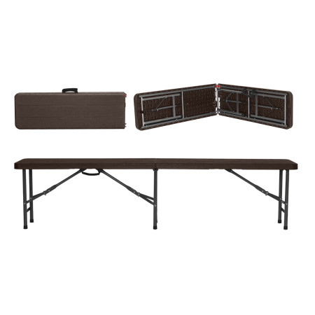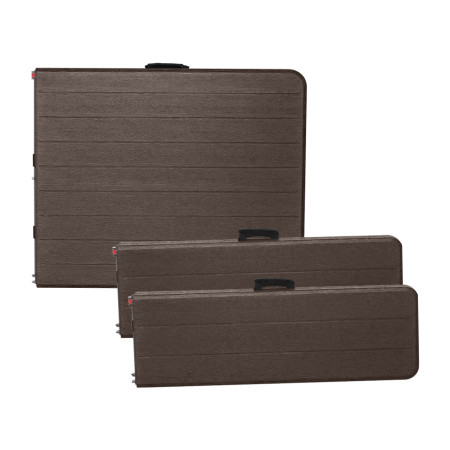 Disponível na cor castanha com efeito de madeira, com materiais leves e duráveis para utilização no exterior. Resiste a condições climatéricas como a humidade e os raios UV. Leve-o para qualquer lado e desfrute do bom tempo onde e quando quiser.