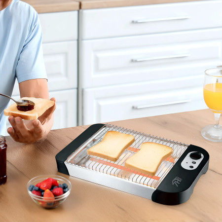 Equipada com botão ON/OFF, luz indicadora e aviso sonoro. Quando o pão está perfeitamente tostado, emite um sinal sonoro para evitar que se queime. Esta torradeira horizontal tem um design compacto e funcional que cabe em qualquer bancada de cozinha. Pode até guardá-la sem esforço numa gaveta ou num armário, ocupando o mínimo de espaço. O nosso modelo FlatToast 600W tornar-se-á um utensílio indispensável para preparar deliciosos pequenos-almoços e lanches perfeitos.