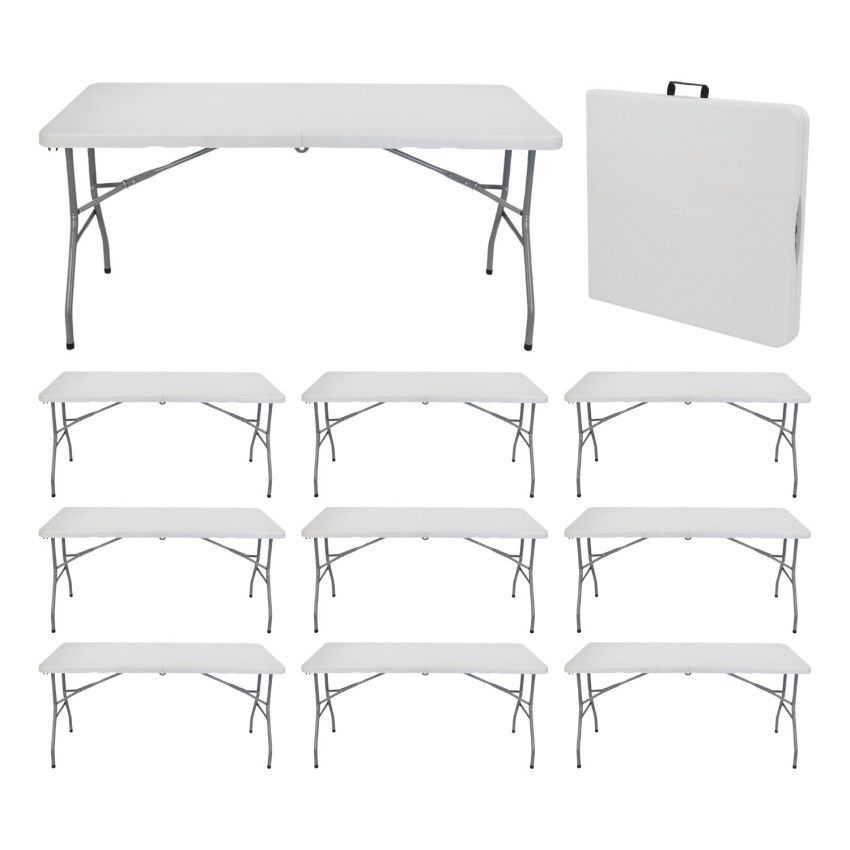 Megapack de 10 mesas dobráveis rectangulares portáteis de 150 cm da Thinia Home, a solução ideal para as suas actividades no interior e no exterior. Fabricadas em resina de alta qualidade e com uma estrutura de aço, estas mesas distinguem-se pela sua durabilidade e estilo. O seu design compacto e leve, juntamente com uma pega de transporte, facilita a sua deslocação para qualquer local, seja em casamentos, comunhões, baptizados ou outros eventos importantes.